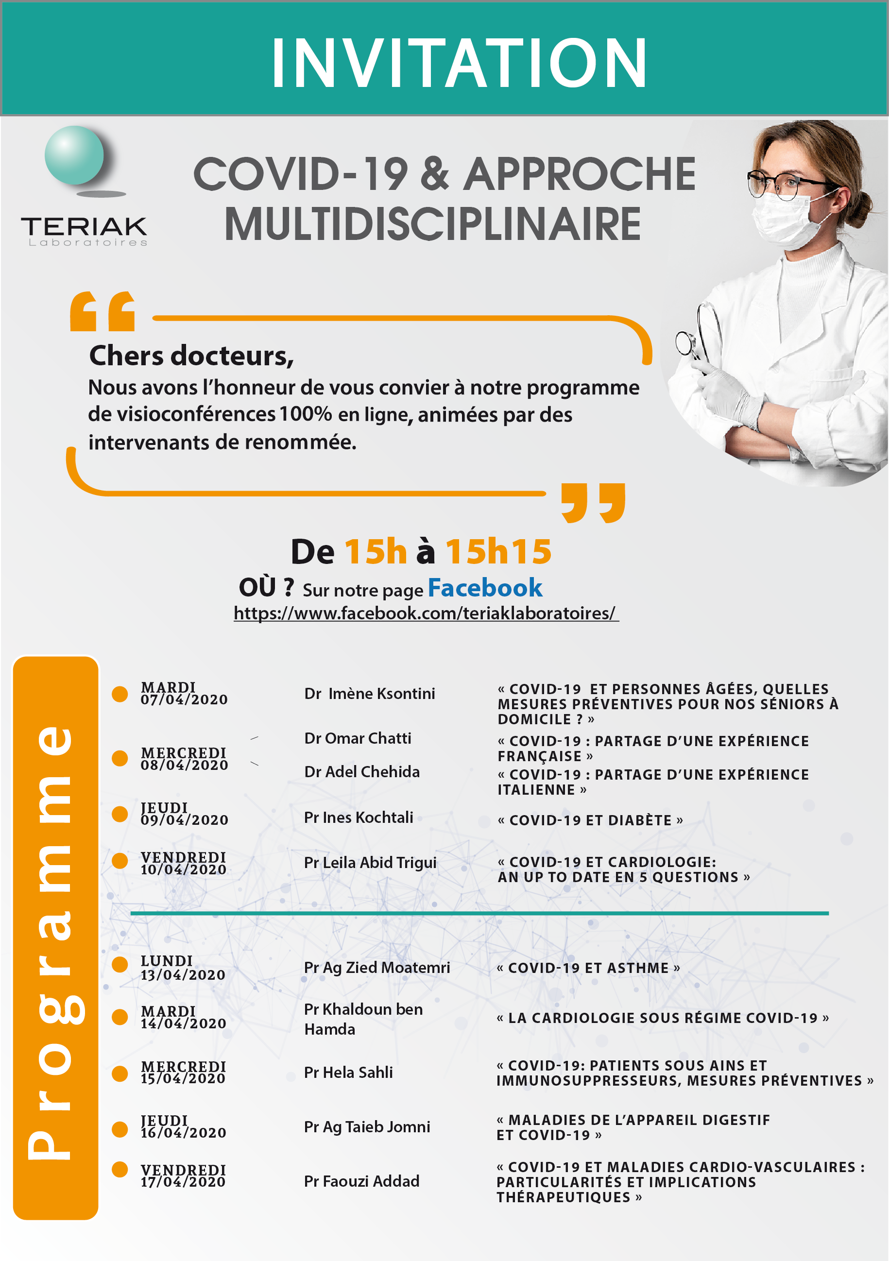 Nous avons l’honneur de vous convier à notre programme de visioconférences 100% en ligne qui se déroulera du 07 au 23 avril 2020 à partir de 15h sur notre page Facebook https://www.facebook.com/watch/teriaklaboratoires/662965424249370/